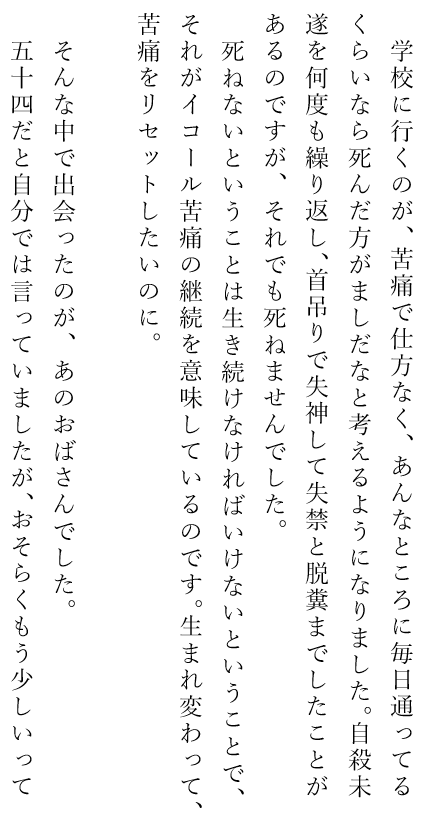 「たいへんご苦労なさってきたんですね。一度、その、面接がてらお話を聞かせていただけませんか。うちの事業所というかワーキングコーポレーションというNPO法人は、職員でそういう方もたくさんいらっしゃるというか、むしろそういう方ばかりでして」