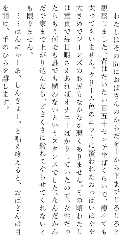 そういえば、よく正直とするのが、おむつプレイだ。これはセックスの時に赤ちゃんごっこをするわけではなくて、大人の介護用のおむつを買ってきてそれをわたしが履いて、コンビニでレジのお会計中に漏らすというものだ。漏らすタイミングは正直から指示が来る。ちょっと離れた場所から見守っていて、ラインに「うんこ」とか「おしっこやや多め」とか指示が来て、スイカでとかペイペイでとか店員さんに言っている最中に指示通り漏らすのだ。でもわたしは便秘気味なので、おしっこの方は大丈夫なのだが、うんこが指示通り出せずにいつもイキんで終わりか、出たか出てないかくらいしか出せない。最悪の場合、長めの屁が出て終わりというパターンもある。それを見ながら正直はニヤニヤして股間をモッコリさせている。わたしも背徳感と公衆の面前で漏らしている恥ずかしさで頭がトロトロになって、乳首が固くなり、子宮がキューッとなる。皆の視線が密かに現在進行形でお漏らし中のわたしに突き刺さり、子供たちの甲高い声が店の中に響いている。