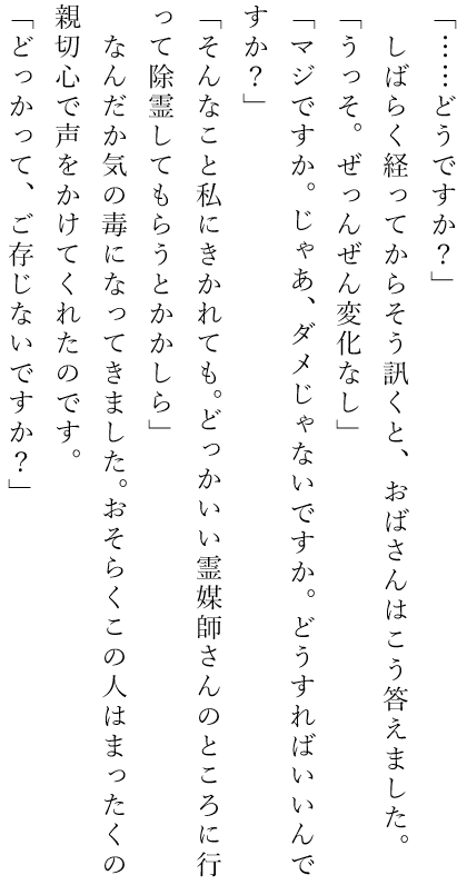 ためしに面接だけ行ってみようかな、と思った。さっき伝えた電話番号もデタラメだし、履歴書を持ってこいと言っていたが、そんなものを提出したら個人情報だだもれで、ばんばん電話がかかってきて出なかったら家まで押しかけて来られそうだから、書いたんだけど家にうっかり忘れてきちゃった的な感じにしよう。なんとかの集いとかなんたら先生の講演会とかに誘われても行かなければいい。行きます、行きます、絶対に行きます、と約束して行かない。興味を持ったふりをして、前のめりを装って安心させ、行かない。