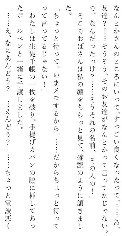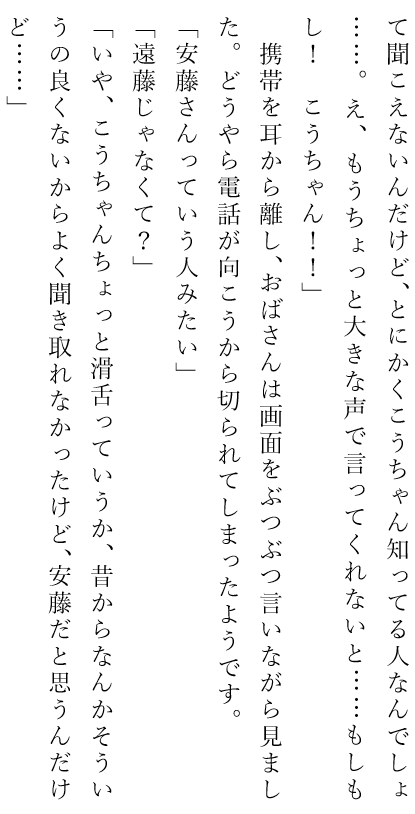 広田は慌ててわたしがさっき伝えた番号に電話をかけるが、適当に思いついた番号を言っただけだから、その番号は現在使われておりません、になるか、どこかの誰かにつながって、その人に開口一番もう集いは始まってるんですが、いまどこですか? もう時間過ぎてるんですけど、となじるが、あのー、どちら様ですか? と訊かれ、ようやく広田はその電話口の相手がわたしではないことに気づく。あの、すみません、失礼ですがお名前……? と聞いたところで児島だよ! と怒鳴られて電話は切られる。