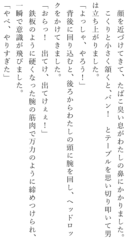 外に出すと言っていたはずなのだが、結局男はペニスを最後まで抜かず、残らず中に出し切った。ああ、やられたとわたしは思ったのだが、頭が快感で麻痺していてうまく働かなかった。
