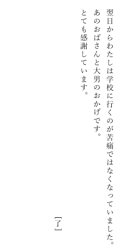 正直からラインが来て、高崎行きが延期になったという。理由はお父さんの血圧が上がったから。それが嘘だということはわたしでなくても誰にでも分かっていたことだけれど、とにかくOKと返事をしておいた。
